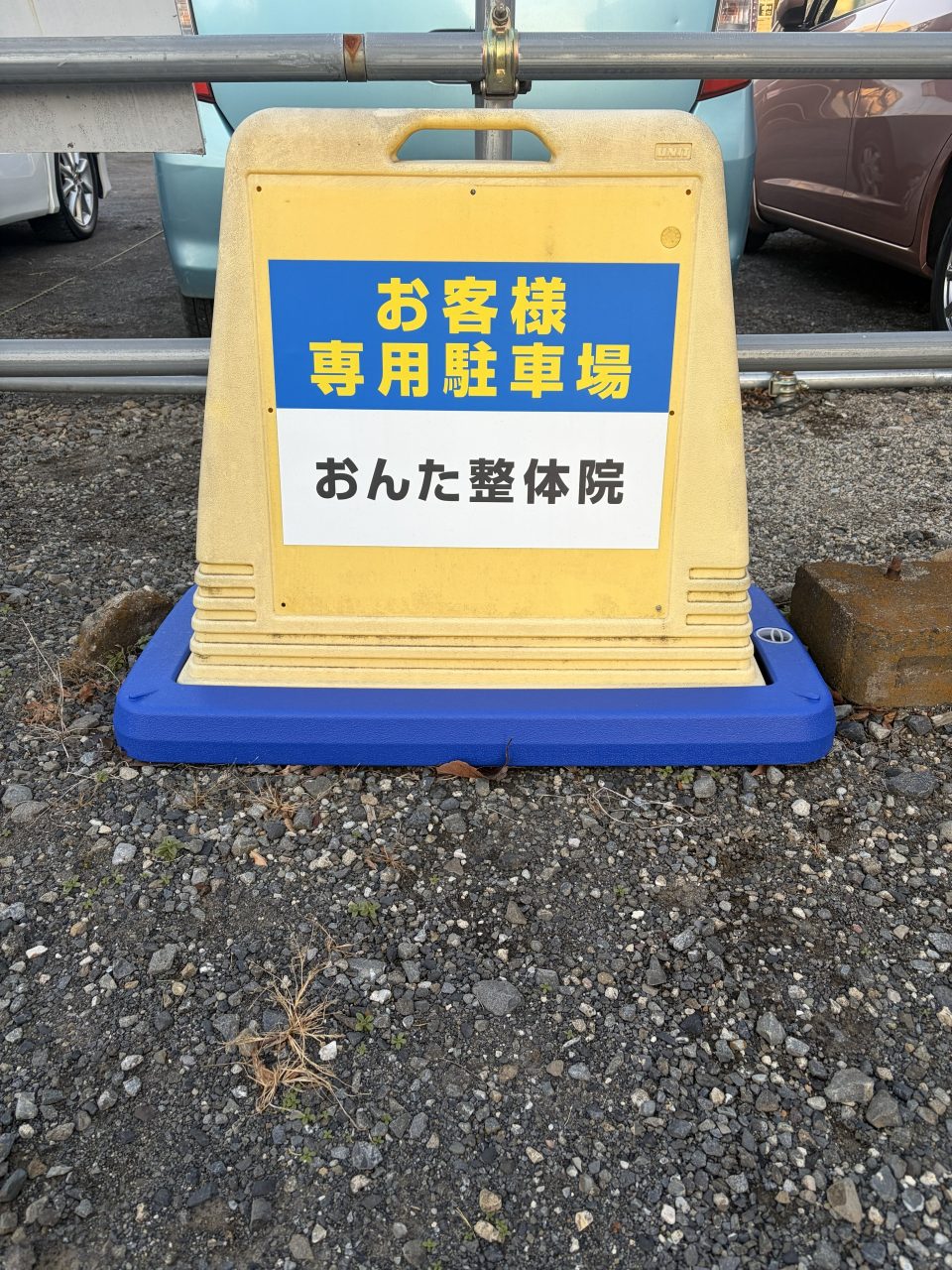 歩道から数えて2番目と3番目に【お客様専用駐車場 おんた整体院】と書かれた黄色のサインキューブ(写真)が置いてありますので、その場所に停めてください。